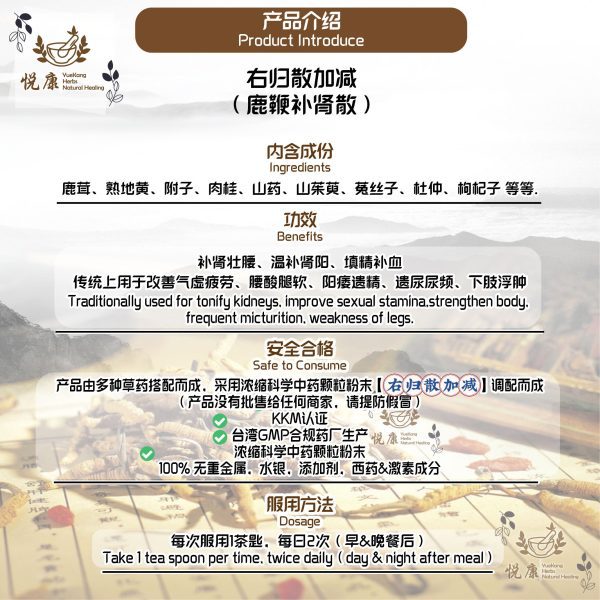 由多种草药搭配而成,采用浓缩科学中药颗粒粉末【右归散加减】调配而成